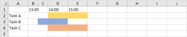 Note: suppose task A ends at 15:30. Use the trick explained above to "split" cell E2. Download the Excel file and give it a try.