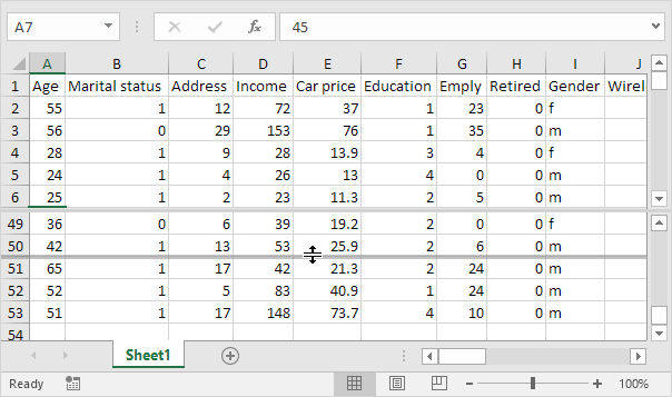 3. Notice the two vertical scroll bars. For example, use the lower vertical scroll bar to move to row 49. As you can see, the first 6 rows remain visible.