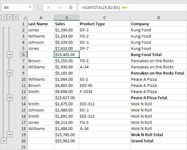 Explanation: in this example, Excel automatically added 5 SUBTOTAL functions (B6, B9, B13, B19 and B20). Follow the link for more information.