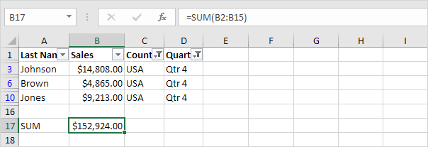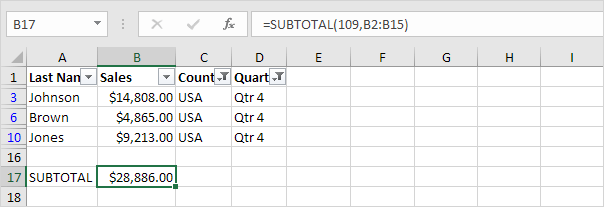 Explanation: in this example, we also filtered by Country. Excel uses the SUBTOTAL function to correctly calculate the total sales in the USA.