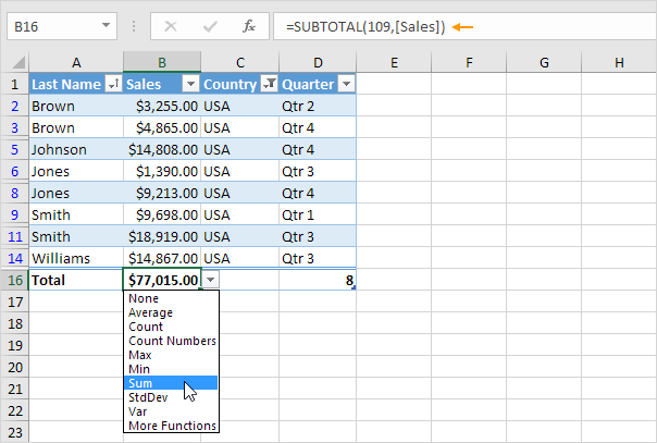 1. The first option. Create a table and add a total row to the bottom of the table. Next, click any cell in the last row to automatically add a SUBTOTAL function.