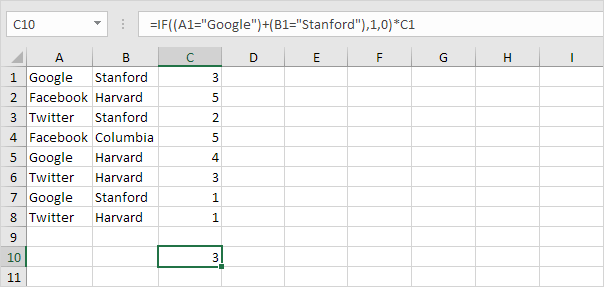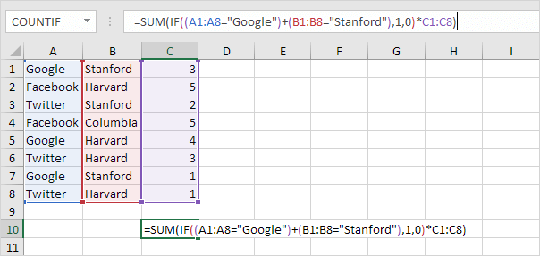 2a. However, if we want to sum the cells that meet the following criteria: Google or Stanford (two criteria ranges), we cannot simply use the SUMIF function twice (see the picture below). Cells that meet the criteria Google and Stanford are added twice, but they should only be added once. 10 is the answer we are looking for.