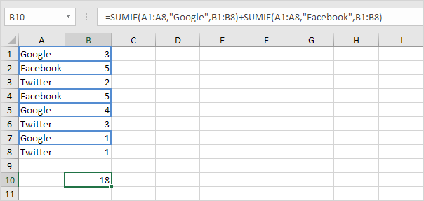 1. The formula below sums the cells that meet the following criteria: Google or Facebook (one criteria range). No rocket science so far.