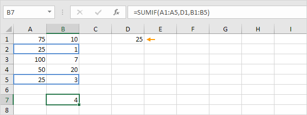 4. The following SUMIF function gives the exact same result (second argument refers to cell D1).