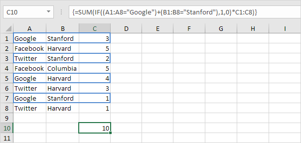 Note: cells that meet the criteria Google and Stanford are added twice, but they should only be added once. 10 is the answer we are looking for.