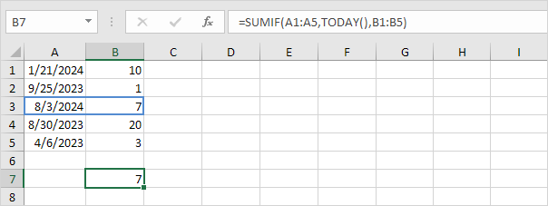 3. The SUMIF function below (three arguments, last argument is the range to sum) sums values in the range B1:B5 if the corresponding cells in the range A1:A5 contain the value 25.
