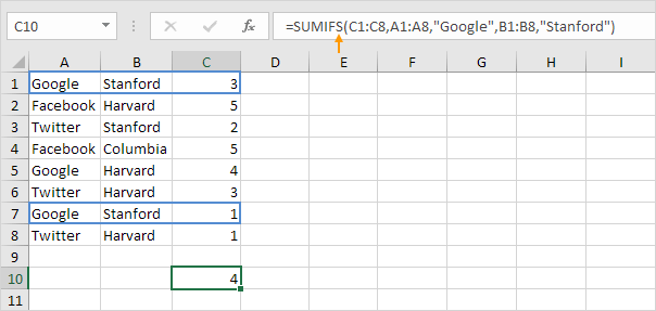 1. For example, to sum the cells that meet the following criteria: Google and Stanford (two criteria ranges), simply use the SUMIFS function (with the letter S at the end).