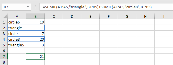 5. The SUMIF functions below sum values in the range B1:B5 if the corresponding cells in the range A1:A5 contain exactly triangle or circle8.