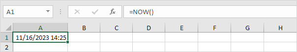 Note: the NOW function takes no arguments. This time will update automatically whenever the sheet is recalculated. This happens when you make a change to any cell or when you open the workbook. Press F9 to manually recalculate the workbook.