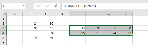 1. For example, cell B4 below is blank. The TRANSPOSE function converts this blank cell to a zero (cell G3).