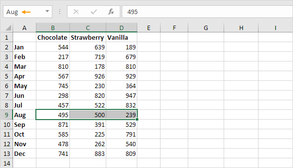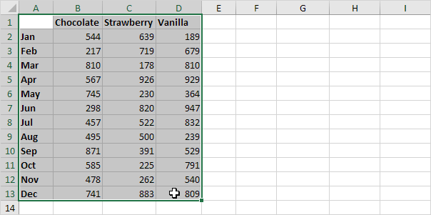 To lookup a value in a two-dimensional range, use INDEX and MATCH in Excel. Below you can find the sales of different ice cream flavors in each month.