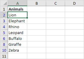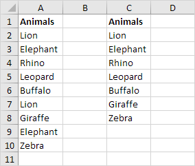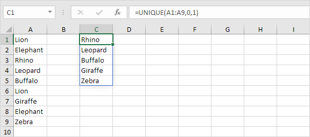 Note: Excel removes all duplicate values (Lion in cell A7 and Elephant in cell A9) and sends the unique values to column C. You can also use this tool to extract unique rows in Excel.