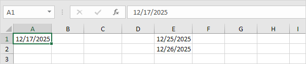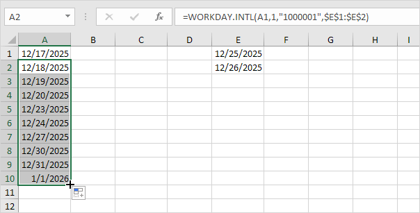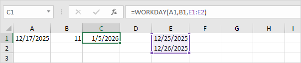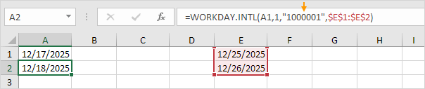 1. Enter the date 12/17/2025 into cell A1 and specify a list of holidays (E1:E2).