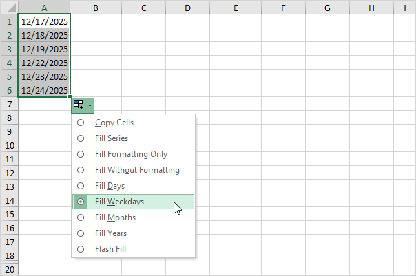 3. Instead of filling in days, use the AutoFill options to fill in weekdays (ignoring weekend days).