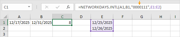 1. The NETWORKDAYS function below returns 11. There are 11 workdays between 12/17/2025 and 12/31/2025.