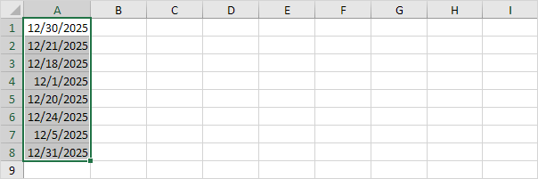 Explanation: always write the formula for the upper-left cell in the selected range. Excel copies the formula to the other cells. Use the formula =OR(WEEKDAY(A1)=1,WEEKDAY(A1)=7) to highlight weekend dates.