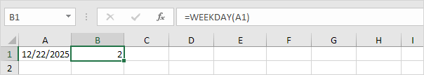 1. The WEEKDAY function below returns 2. 12/22/2025 falls on a Monday.