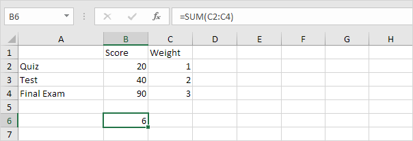 Explanation: this formula performs the same calculation as before, but solely relies on the SUM function. It multiplies each score by its corresponding weight, sums up the products, and then divides by the sum of the weights, providing the weighted average.