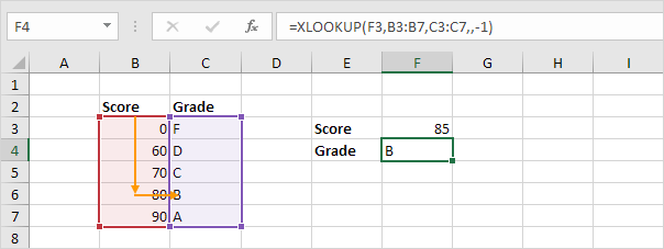 2. Fortunately, the value -1 (fifth argument) tells the XLOOKUP function to find the next smaller value. In this example, the value 80.