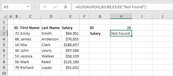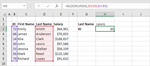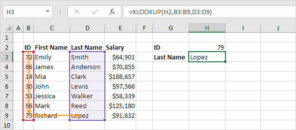3. Here's another example. Instead of returning the salary, the XLOOKUP function below returns the last name (replace E3:E9 with D3:D9) of ID 79.
