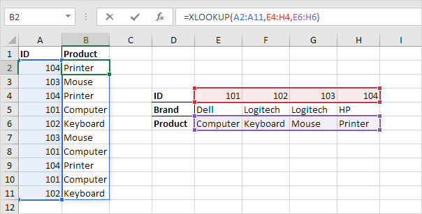 Note: the XLOOKUP function, entered into cell B2, fills multiple cells. Wow! This behavior in Excel 365/2021 is called spilling.