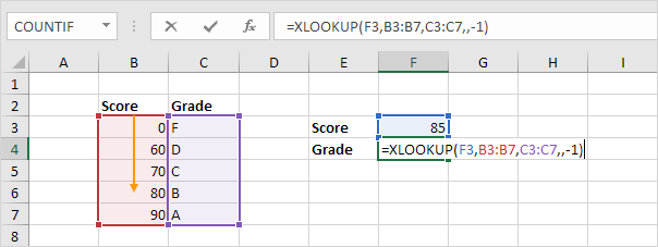 Note: use 1 instead of -1 for the fifth argument to find the next larger value. In this example, the value 90. The XLOOKUP function also works with unsorted data. In this example, there's no need to sort the scores in ascending order.