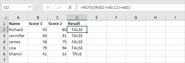 Explanation: the AND function returns TRUE if the first score is greater than or equal to 60 and the second score is greater than or equal to 90, else it returns FALSE. Visit our page about the AND function to learn more about this Excel function.