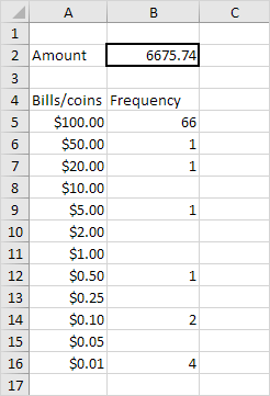 Below we will look at a program in Excel VBA that splits an amount of money into bills and coins.