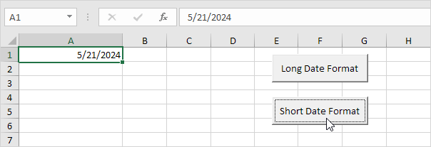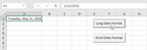 To change the date format in cell A1 to the long date format, place a command button on your worksheet and add the following code line: