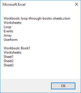 Below we will look at a program in Excel VBA that loops through all open workbooks and worksheets, and displays all the names.