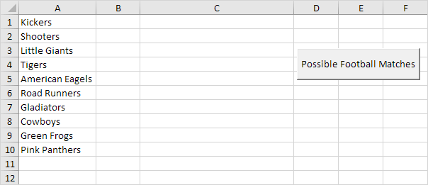 Below we will look at a program in Excel VBA that shows a print preview of all the possible football matches from a list of teams.