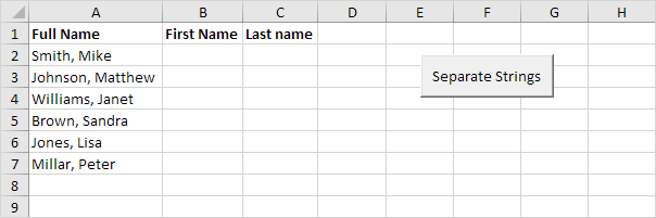 The problem we are dealing with is that we need to tell Excel VBA where we want to separate the string. In case of Smith, Mike the comma is at position 6 while in case of Williams, Janet the comma is at position 9.