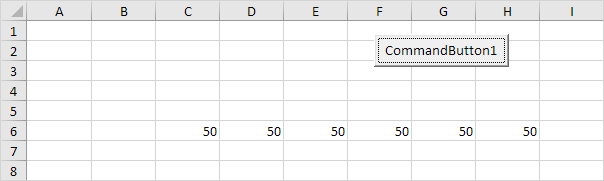 Explanation: the code lines between For and Next will be executed six times. For j = 8, Excel VBA enters the value 50 into the cell at the intersection of row 6 and column 8. When Excel VBA reaches Next j, it decreases j by 1 and jumps back to the For statement. For j = 7, Excel VBA enters the value 50 into the cell at the intersection of row 6 and column 7, etc.