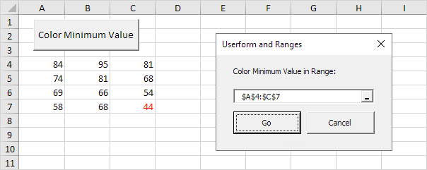 Explanation: first, we get the address from the RefEdit control and store it into the String variable addr. Next, we set rng to the range specified in the RefEdit control. Next, we use the worksheet function Min to find the minimum value in the range. Finally, we color the minimum value(s) using a loop.