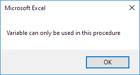 Explanation: now you can create a new module and place a sub called sub3 into this module. Use the same code as sub2. Add sub3 to your command button code. When you click the command button on the worksheet, you will get three message boxes saying "Variable can only be used in this procedure" (see downloadable Excel file).