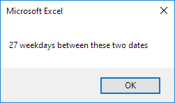 7. Finally, we display the number of weekdays using a MsgBox. We use the & operator to concatenate (join) two strings. Although weekdays is not a string it works here.