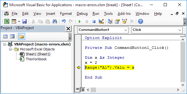 The Range object has a property called Value. Value isn't spelled correctly here. Debugging is a great way to not only find errors, but also understand code better. Our Debugging example program shows you how to single step through your code and see the effect of each code line on your worksheet.